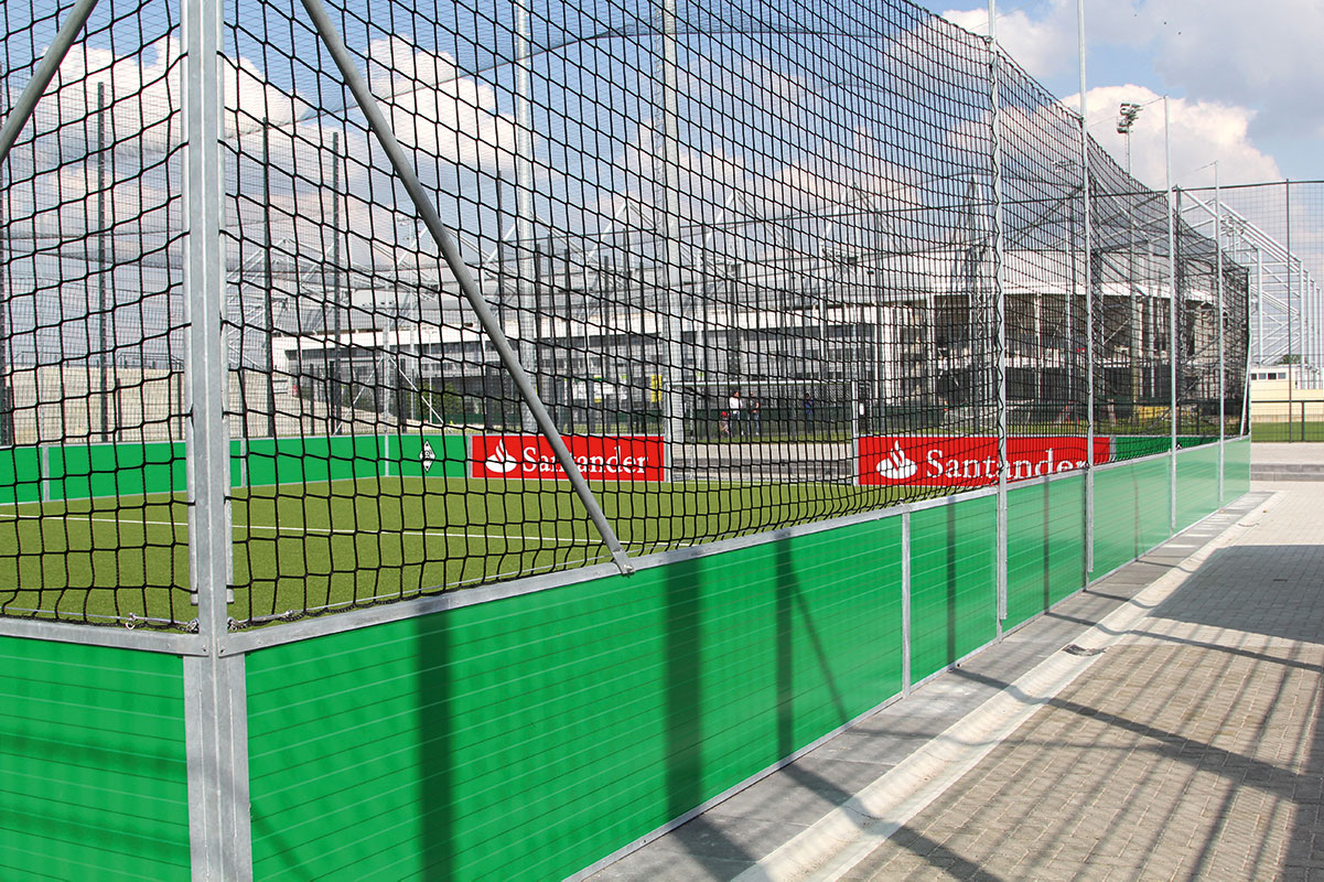 The boards at each end of the pitch bear eye-catching UV-resistant banners emblazoned with advertising for the Santander Bank sponsor and the Borussia diamond.